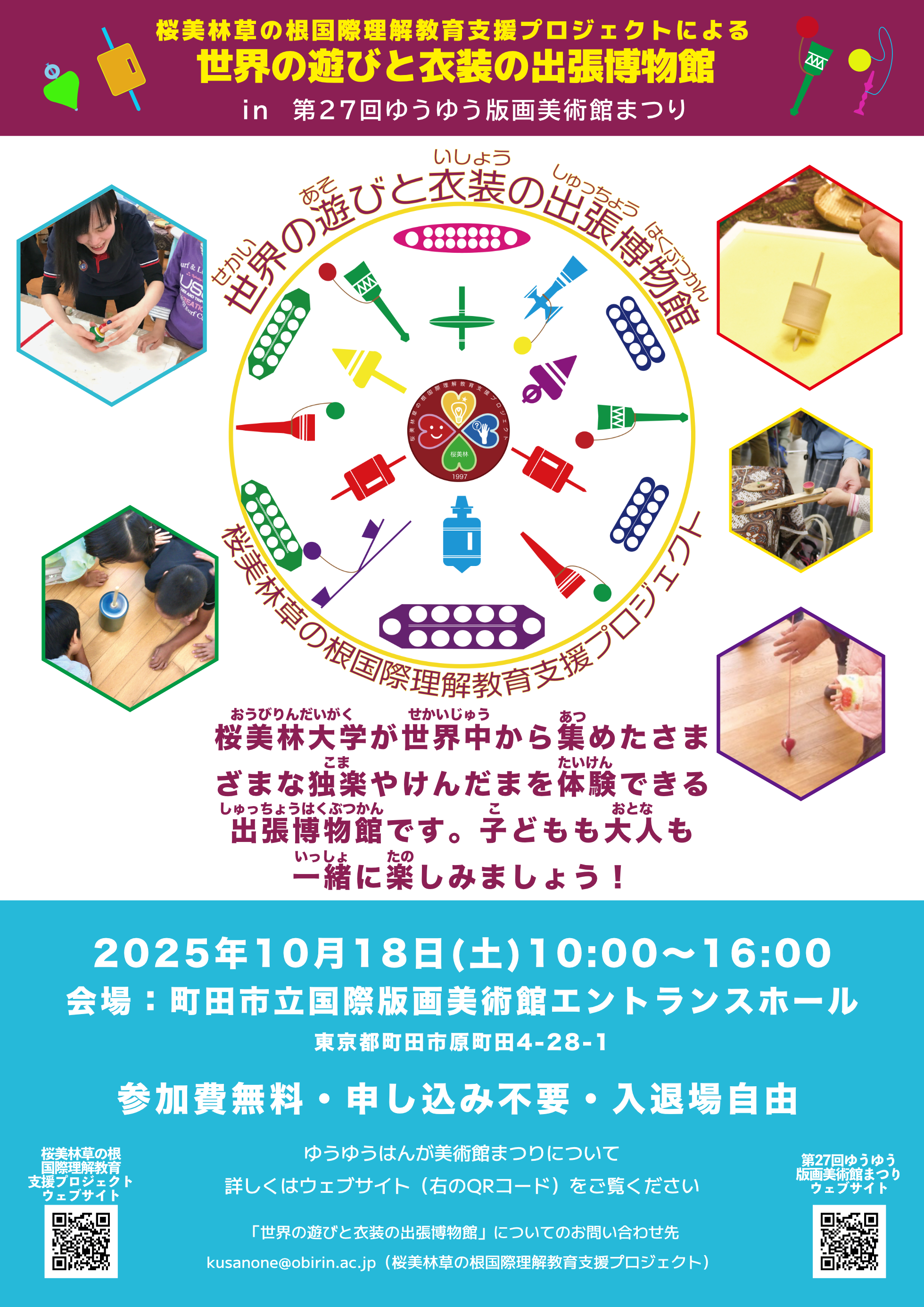 8月8日(火)に横浜YMCAと桜美林学園が包括的連携協定にもとづき「Global Day Trip! 桜美林草の根国際理解教育支援プロジェクトによる「世界の遊びと衣装の博物館」へ行こう」(小学生対象)を実施します。そのなかで、草の根プロジェクトが企画・実施の「世界の遊びと衣装の出張博物館プログラム」を行います。このプログラムは、草の根プロジェクトの教育支援活動のなかでも長年親しまれてきたプログラムですが、コロナ禍をへて3年ぶりの実施となります。