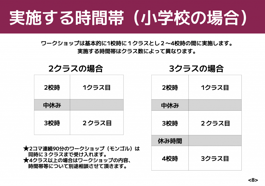 - 学校でワークショップ実施する場合の時間帯について