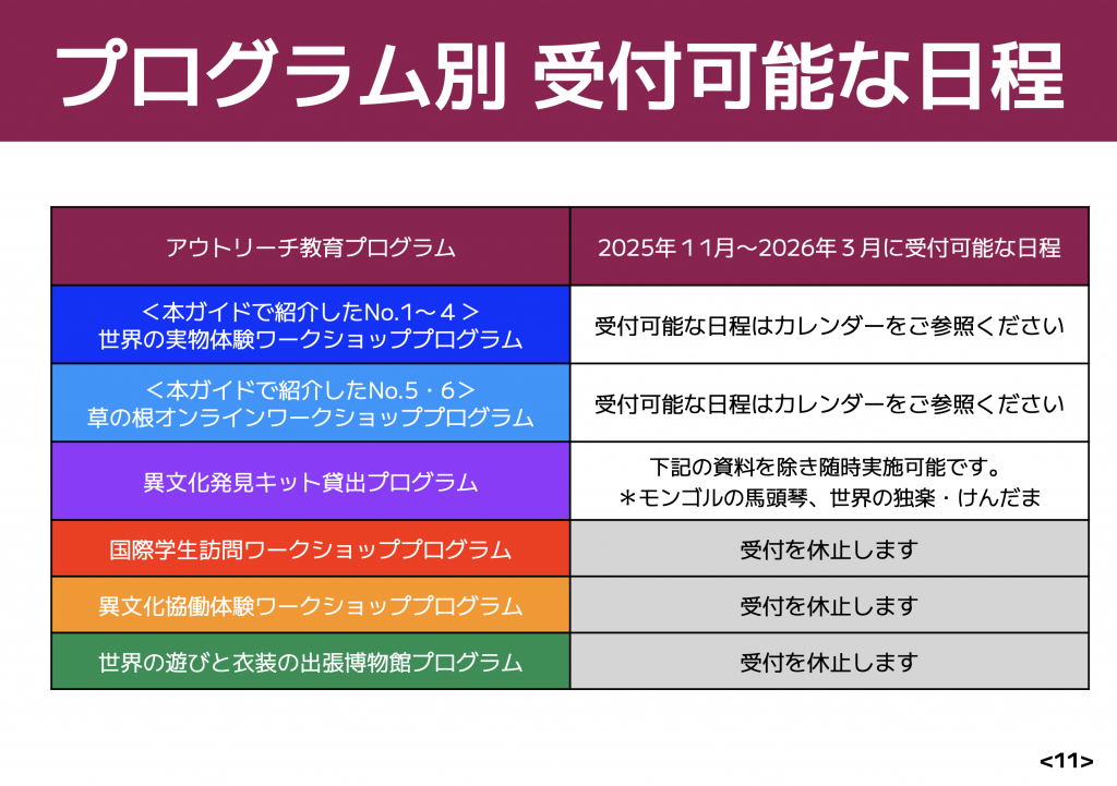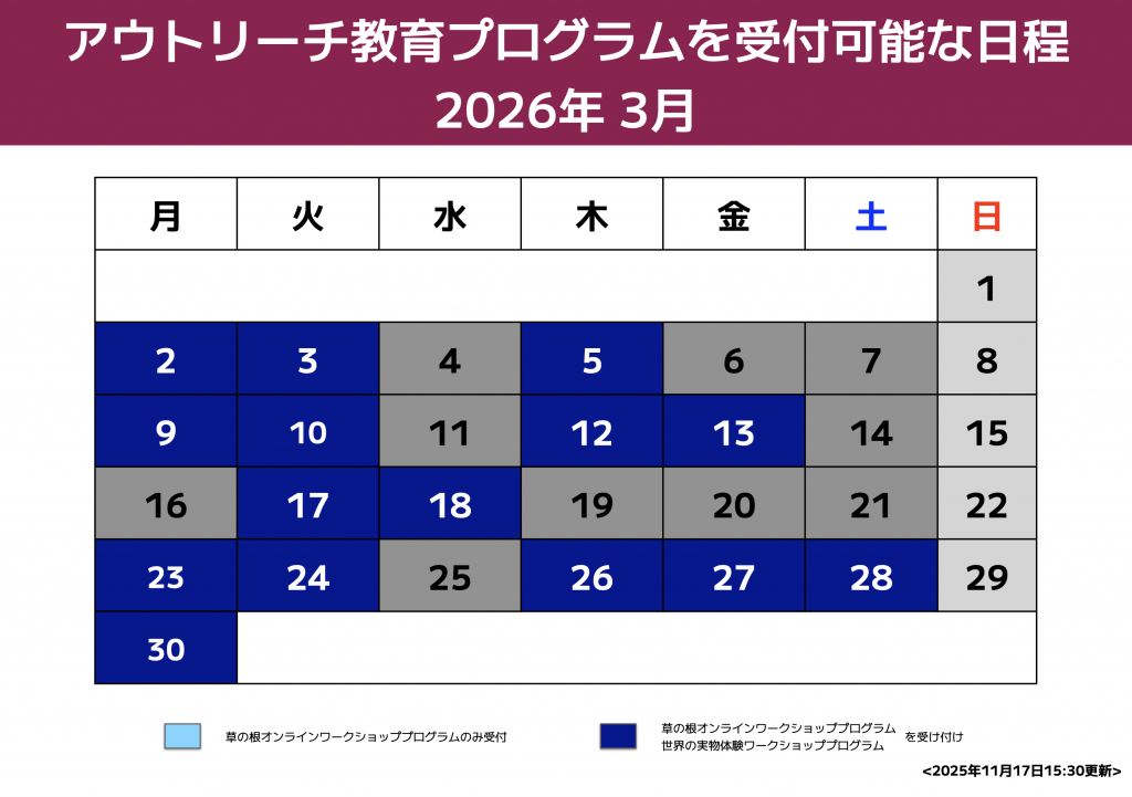 こちらでは2026年3月までにご依頼を受け付可能なプログラムと日程、方法等についてご案内いたします(1月は受付を休止します)。