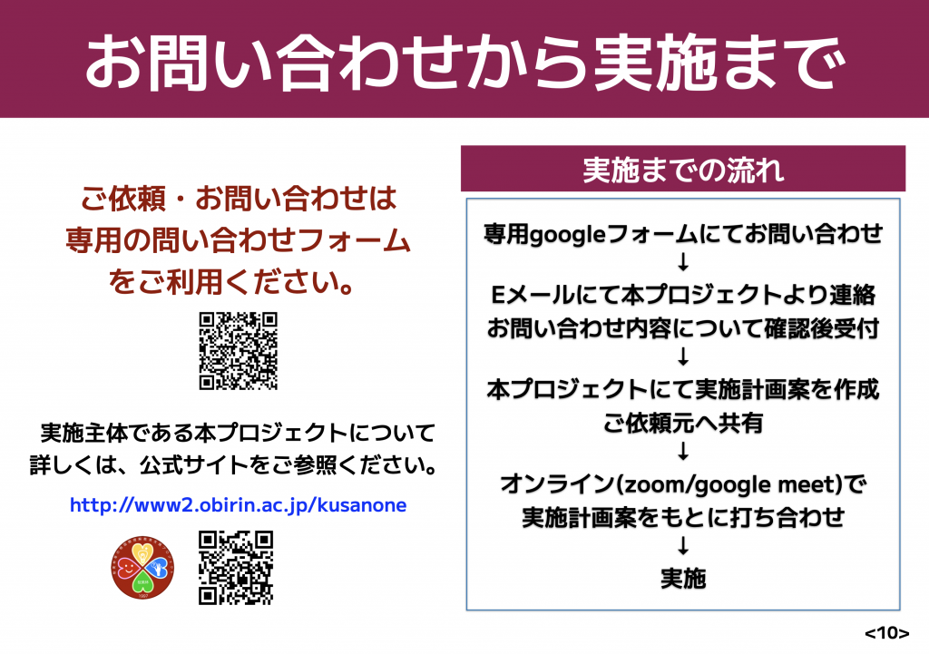 当サイトの「アウトリーチ教育プログラムの利用方法のご案内」もご確認の上、専用のフォームをご利用ください。フォームの送信内容を確認後本プロジェクトよりEメールにてご連絡させて頂きます。お問い合わせ後の流れは以下のようになります。